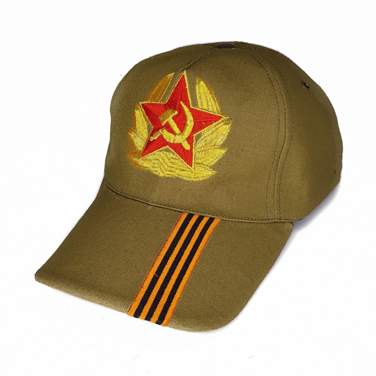 Бейсболка хаки вышитая Кокарда СА р/с. Бейсболка спортивный головной убор, кепка особого фасона с большим козырьком и высокой тульей. Это удобный и хороший аксессуар, который не только украсит повседневный образ, но эффективно защитит от палящего солнца в жаркий день. Головной убор широко используется как в мужском, так и в женском гардеробе, унисекс. Бейсболка кепка СССР имеет вышивку серп и молот в звезде Советской Армии на тулье, и георгиевская лента на козырьке. Размер универсальный one size регулируется под индивидуальные потребности, цвет хаки (горчичный). Имеются отверстия (люверсы), которые обеспечивают максимальное проветривание головы.