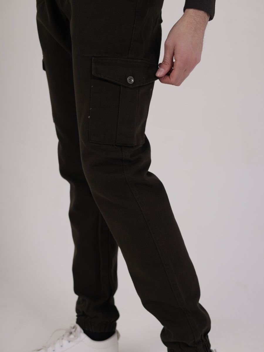 Брюки мужские представлены в цвете хаки (олива). Джоггеры удачная модель объединившая спортивный стиль с городским. Штаны стильно смотрятся и хорошо сочетаются с футболками, куртками, рубашками. Отлично вписываются у каждого мужчины, женщины, подростка в гардеробе. Материал джоггеров состоит из 97% хлопка, 3% полиэстер. Для различных аксессуаров предусмотрено 6 карманов: 2 прорезных, 2 накладных на бедрах, 2 накладных задних кармана. Все карманы глубокие и функциональные и ими удобно пользоваться. Отличительная черта этих спортивных штанов является резинка на талии, а также манжеты на щиколотках в виде резинки. Благодаря резинкам при необходимости брюки можно легко поднять. Брюки удобно носить с высокими берцами, кроссовками, мокасинами. Коллекцию карго джогерров весна-лето можно увидеть не только на стадионах и в спорт залах, но и на улицах и даже в офисах.