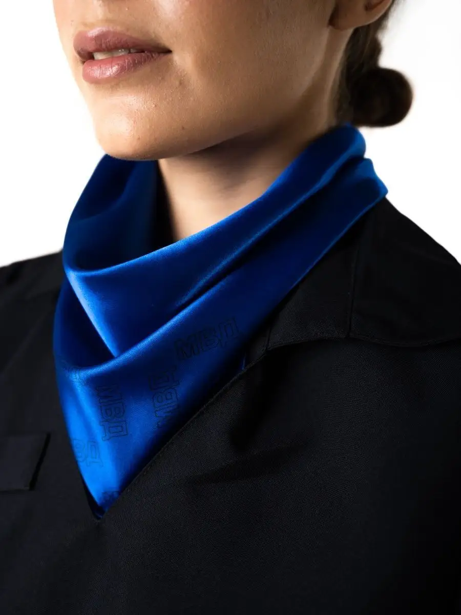 Женский атласный платок Юстиции на шею в виде треугольной косынки для сотрудников ОВД. Материал: креп-сатин. Внешняя сторона - гладкая атласная, изнанка - матовая. Края косынки обработаны оверлоком. По всей косынке, кроме центральной части, нанесена надпись "МВД". Предназначена для ношения с платьем Полиции. Длина 140см, ширина 35см.