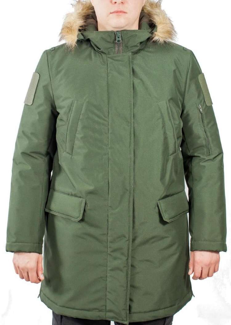 -Воротник — стойка, переходящий в несъёмный капюшон, отороченный искусственным мехом;