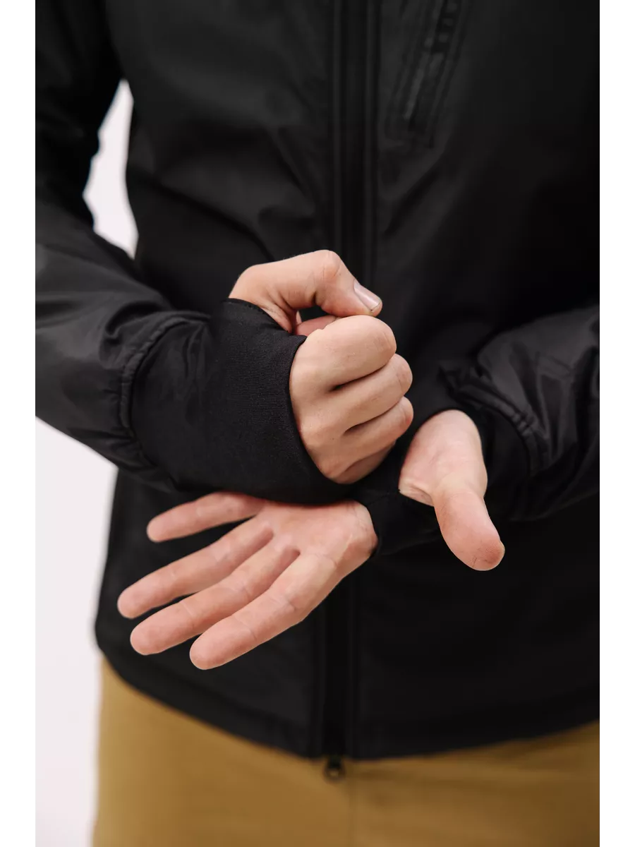 Отверстие для большого пальца внизу рукавов (манжета) позволяет быстро одевать при необходимости верхние слои. Капюшон регулируется по овалу лица, есть козырек не отстегивается, но его можно убрать при необходимости в воротник, когда его не нужно использовать. Это очень удобно, когда вы находитесь в открытом пространстве и хотите сэкономить место в рюкзаке.
