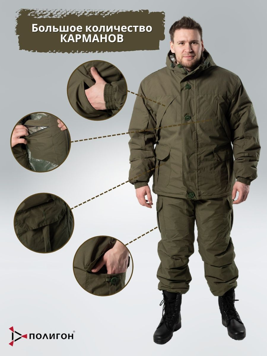 Костюм зимний Горка 6 в цвете оливковом и мультикам. Удобный, теплый тактический мужской костюм изготовлен из ткани Грета-Т, смесовая ткань выполнена таким образом, что полиэфирная нить выполнена на лицевую поверхность, что обеспечивает высокую износостойкость и легкое удаление грязи. Хлопок на изнаночной стороне ткани обеспечивает комфорт и хорошее впитывание влаги. Водоотталкивающая отделка защищает от снега, дождя, грязи. Кроме этого, ткань отличается хорошей формоустойчивостью, не шуршит, низкой усадкой и стойкостью окраски. Плотность поверхности ткани: 234 г/м2. Костюм военный рабочий состоит из куртки и комбинезона. Куртка прямого кроя, застегивается на молнию с ветро-влагозащитным клапаном, с пуговицами на канадской ленте. Подклад из фольгированной ткани, позволяет сохранять тепло внутри, отражая его от тела. Куртка имеет 7 карманов (2 накладных с клапаном на пуговице, 2 прорезных нагрудных на молнии, 2 нарукавных на молнии, 1 внутренний на молнии). Капюшон регулируется утяжкой, рукав втачной с манжетом на резинке, утягивающая резинка в районе талии. Комбинезон с центральной бортовой застежкой на тесьму-молнию, с 2 накладными объемными карманами. По линии талии стянут эластичной тесьмой резинкой. Имеются бретели с карабинами фастекс для подгонки по росту. Костюм Горка комфортна для любителей охоты, рыбалки, походов туризма, исследования пещер и других активных видов отдыха, для дачников, для повседневной носки в городе.