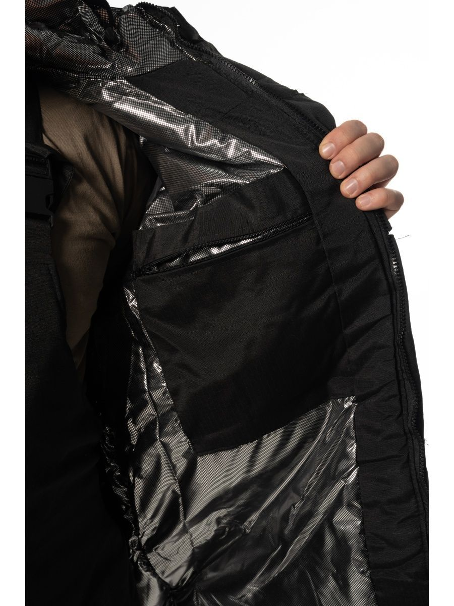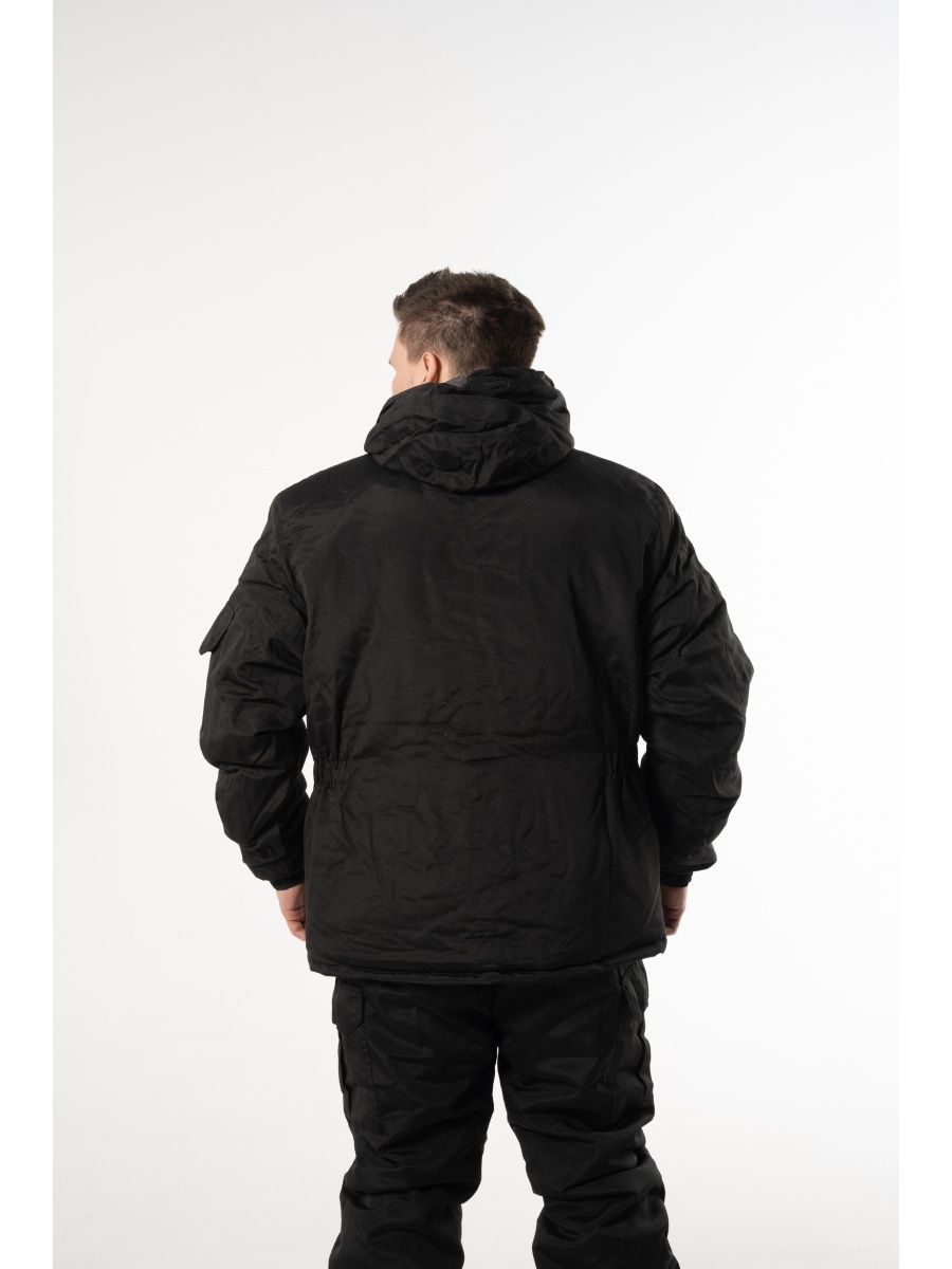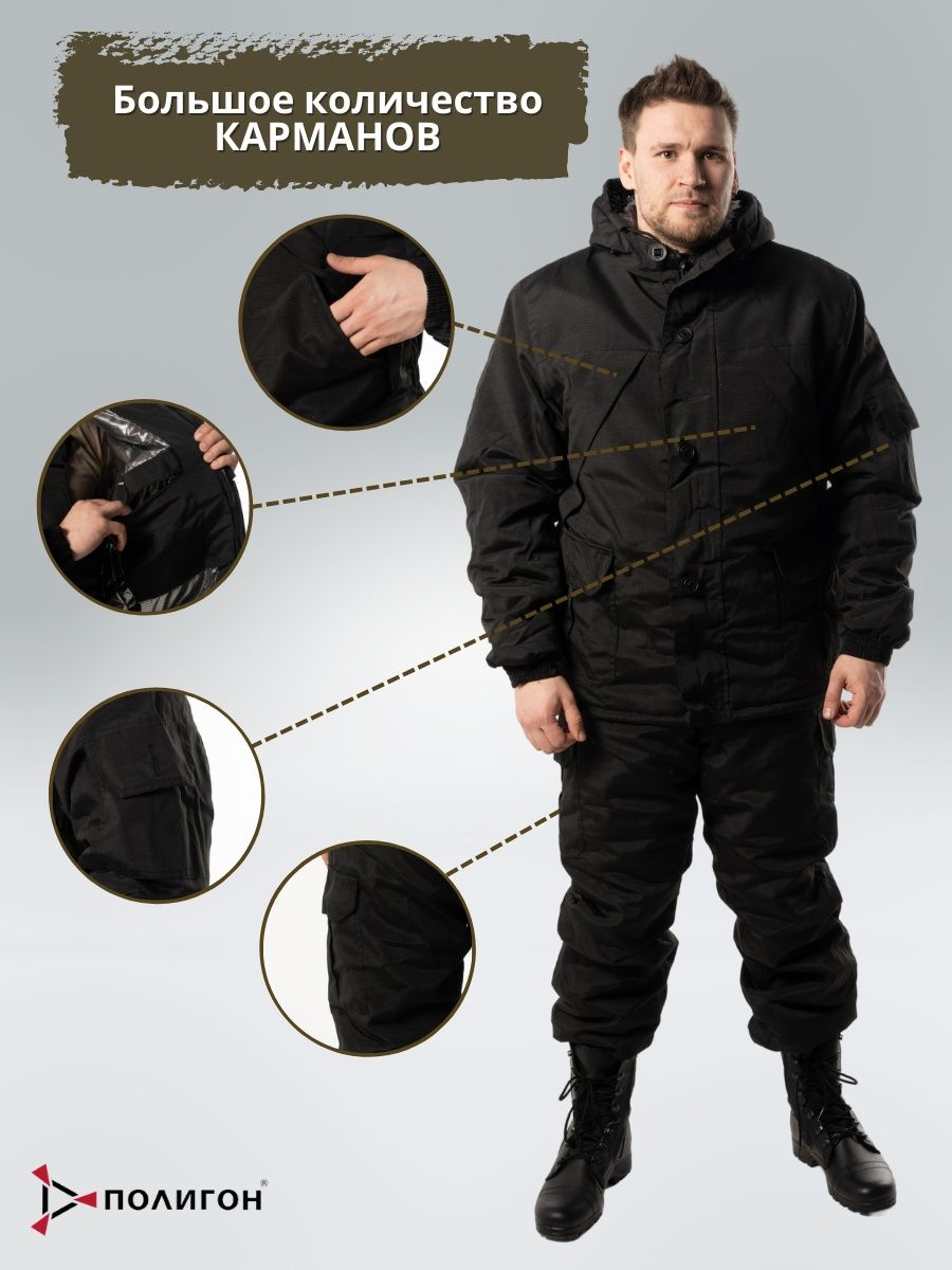 Костюм Горка-6 в черном цвете. Отлично подойдет как для повседневной носки, прогулки с собакой, так и для профессиональной деятельности, охранных структур, для силовых структур, Росгвардии, военным, рабочим (рабочая утепленная одежда). Так же костюм утепленный идеально подойдет для тех, кто занимается охотой, рыбалкой (зимней ловлей), туризмом и другими активными видами отдыха. Удобный, теплый тактический костюм из ткани повышенной прочности, с защитой от влаги, холодного ветра и перепадов температур. Не выгорает, не шуршит и не садится. Костюм состоит из куртки и комбинезона. Куртка прямого кроя, застегивается на молнию с ветро-влагозащитным клапаном, с пуговицами на канадской ленте. Подклад из фольгированной ткани, позволяет сохранять тепло внутри, отражая его от тела. Куртка имеет 6 карманов (2 накладных с клапаном, 2 прорезных нагрудных на молнии, 1 нарукавный, 1 внутренний на молнии). Капюшон регулируется утяжкой, рукав втачной с манжетом на резинке, утягивающая резинка в районе талии. Комбинезон с центральной бортовой застежкой на тесьму-молнию, с 2 накладными объемными карманами. По линии талии стянут эластичной тесьмой. Имеются бретели с карабинами для подгонки по росту.