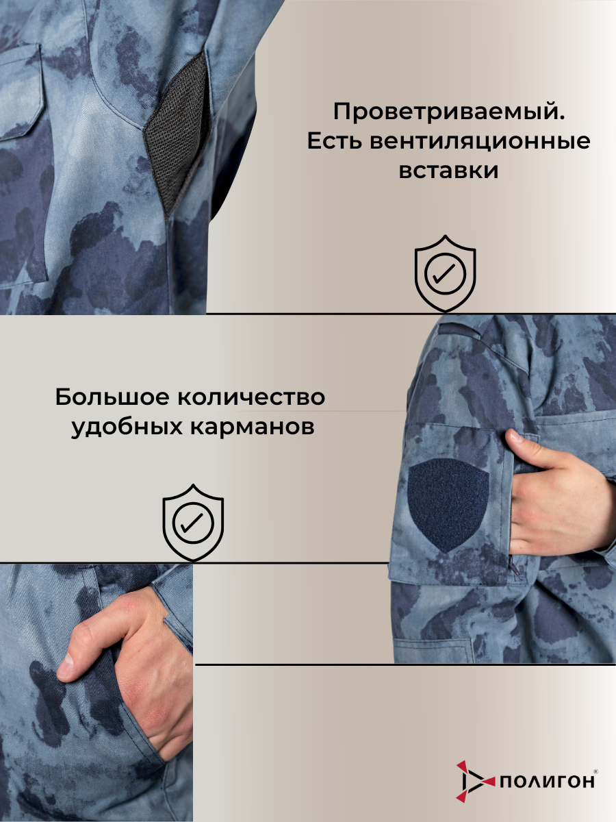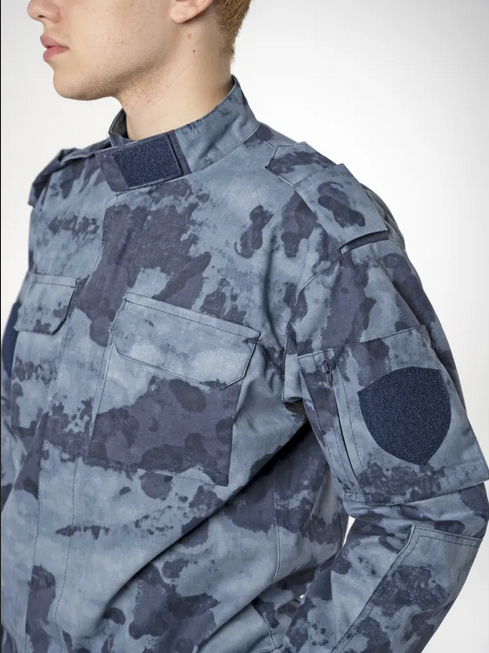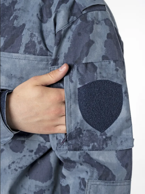 Костюм Росгвардия летний полевой синий МОХ, тактический камуфляжный с длинными рукавами, ткань Сорочка. Состоит: куртка и брюки анатомического кроя, многофункциональной направленности. Крой костюма данной модели не стесняет движений. Для увеличения срока службы изделия в области сидения, внедрены усилительные накладки. Объем брюк, манжеты куртки могут регулироваться текстильными застежками. Текстильные застежки и липучки на костюме выполнены в цвет камуфляжа. На плечах фальшпогоны, на рукавах липучки для шевронов. Большое количество карманов, удобный крой, высокое качество ткани, наличие удобного расположения карманов, исполнение костюма - являются основными плюсами данной модели. Данный костюм можно использовать как уставную форменную одежду, так и в целях активного отдыха, таких как: охота, рыбалка, туризм, страйкбол и т.д.