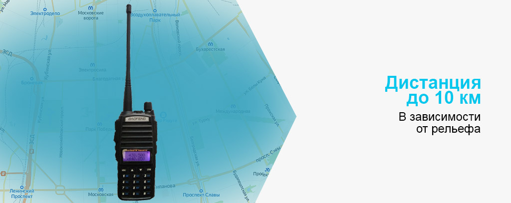 Передатчик с выходной мощностью 5 Вт, позволяет рации принимать и передавать сигнал в радиусе до 10 км на открытой местности и до 3 км в условиях городской застройки.